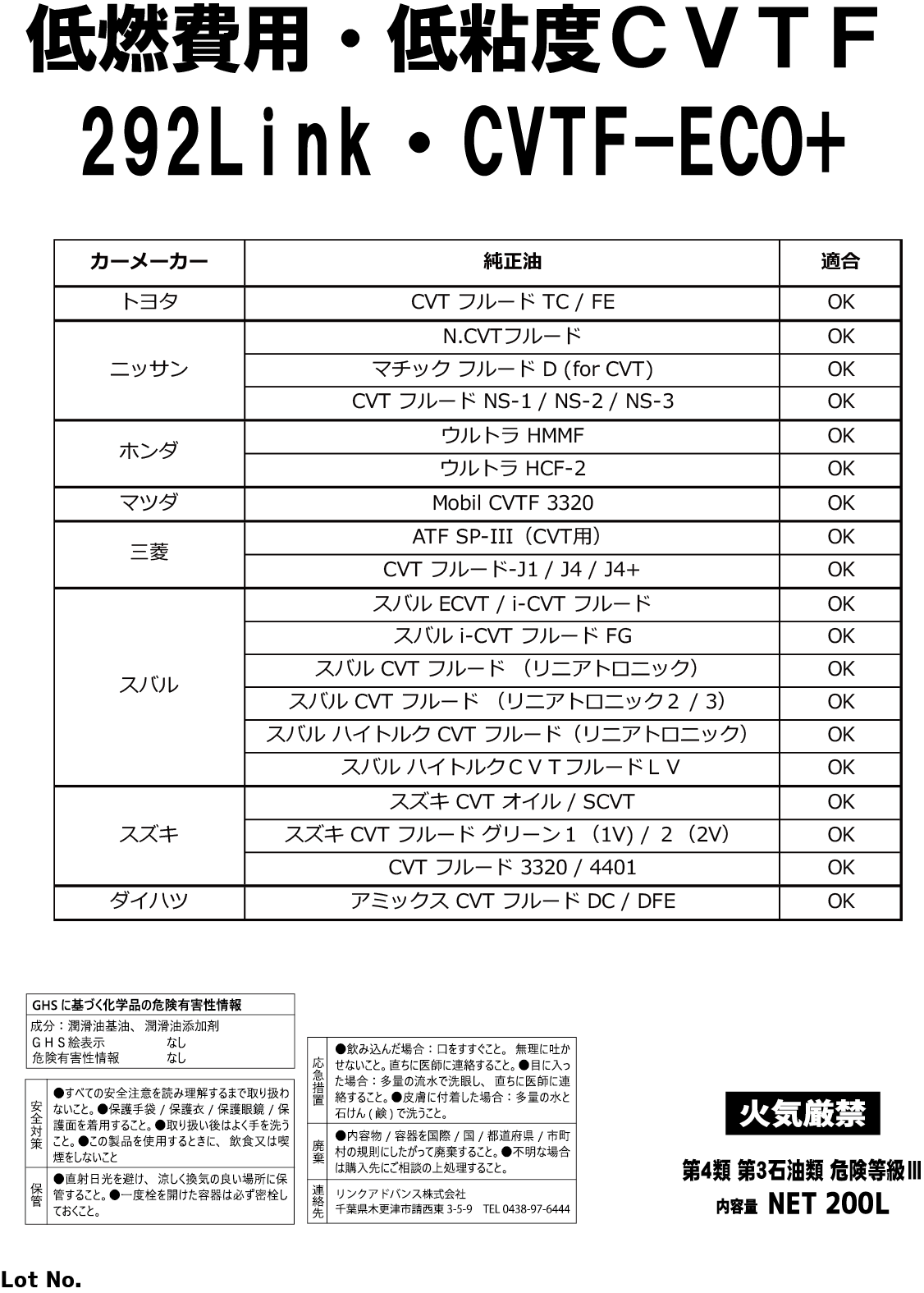 低粘度指定車用のCVTミッション用ATFです。規定の交換方法を順守した上で、 弊社ご用意の適合表をご確認の上、ご使用をおすすめします。